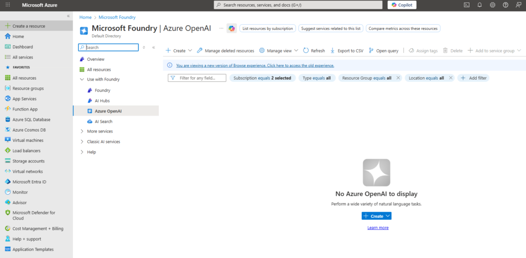 In parallel, I created an Azure OpenAI resource and deployed a chatgpt model. I didn’t focus on advanced configuration here, since the goal of this project was not to explore Azure features in depth, but to understand how chatgpt could be integrated into an analytics workflow.