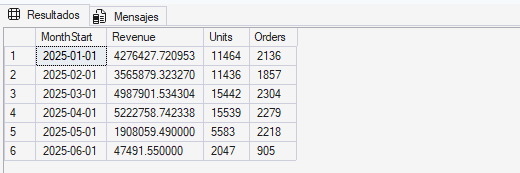 This query aggregates revenue, units, and orders by month over the last six months. I use it as my “macro lens” because it answers the first question an executive would ask: what is happening overall, month by month? Even if later I go deeper by country or customer, I need this baseline to interpret everything else. A spike or drop is not meaningful unless I can see if it is part of a trend, a seasonality pattern, or a sudden shift. This query also helps validate whether the last month looks incomplete or unusually low compared to prior months. In the workflow, it is usually the first query I want the model to see, because it provides context for interpreting drivers, concentration, and changes.