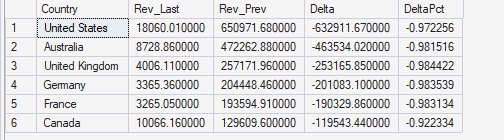 This query compares the last available month against the previous month, grouped by country. The goal is not to create a full time series by country, but to isolate the most recent movement and identify which geographies contributed the most. I calculate Rev_Last and Rev_Prev and then produce Delta (absolute change) and DeltaPct (percentage change). The reason I focus on Delta and sort by absolute impact is that percent change alone can be misleading when baselines are small. With this query, I can quickly see whether a recent drop or spike is broad-based across multiple countries, or concentrated in one region. In an automated insight workflow, this is a key “driver” query because it helps the model explain the “where” behind the last movement.