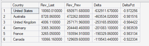 Query 2 — Last month vs prior month revenue drivers (by country)