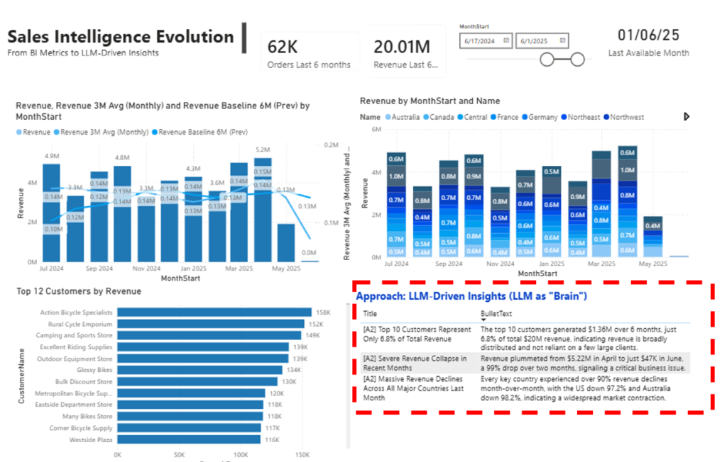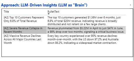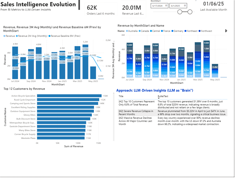 5. There is an even higher level, where the flow SQL → Python → LLM → SQL (Power BI) becomes a loop. In this setup, the system can self-manage within defined limits. For example, it could propose a new query, adjust parameters (like asking for top 20 customers instead of top 12), or explore a different angle. This is where we start talking about a real agent, not just automated insights. I’ll leave that for a future demo.