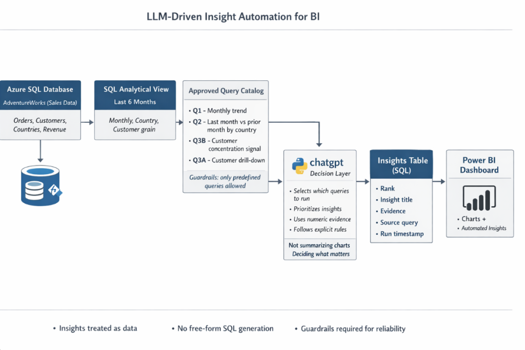 The goal of this project was to test whether part of the insight work that BI teams usually do manually can be automated using chatgpt, without turning this into a complex or overengineered solution. Instead of focusing on perfect dashboards or advanced models, I focused on connecting SQL, Python, chatgpt, and Power BI into a workflow where insights are generated, stored, and displayed automatically.
