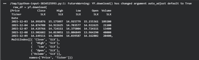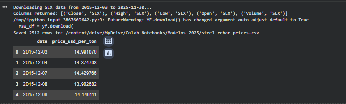 After running the download block, the notebook returns a clean dataframe containing roughly ten years of daily historical prices for the SLX ETF. This dataset will serve as the foundation of the forecasting pipeline. At this point, I verify that the dates are sorted, that there are no unexpected gaps, and that the closing prices are properly formatted as floating-point values. This raw series will later be resampled to a daily frequency to ensure continuity before generating lagged and rolling features.
