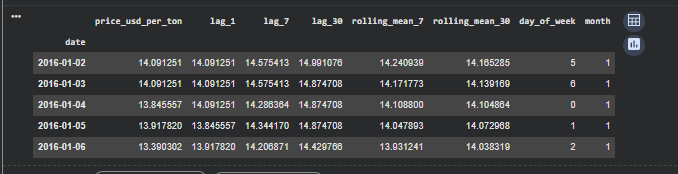 Once the dataset is cleaned and converted into a consistent daily time series, the next step is to transform it into a structure that a machine learning model can learn from. A raw price series contains valuable information, but no model, especially a tree-based regressor, can infer temporal relationships unless those relationships are explicitly provided as input features. To address this, I create a set of lag variables (lag_1, lag_7, lag_30) that capture short-term, weekly, and monthly price dependencies, as well as rolling averages (rolling_mean_7, rolling_mean_30) that help smooth noise and emphasize broader trends. I also include simple calendar features such as the day of the week and the month, which can sometimes capture seasonal patterns in commodity markets.