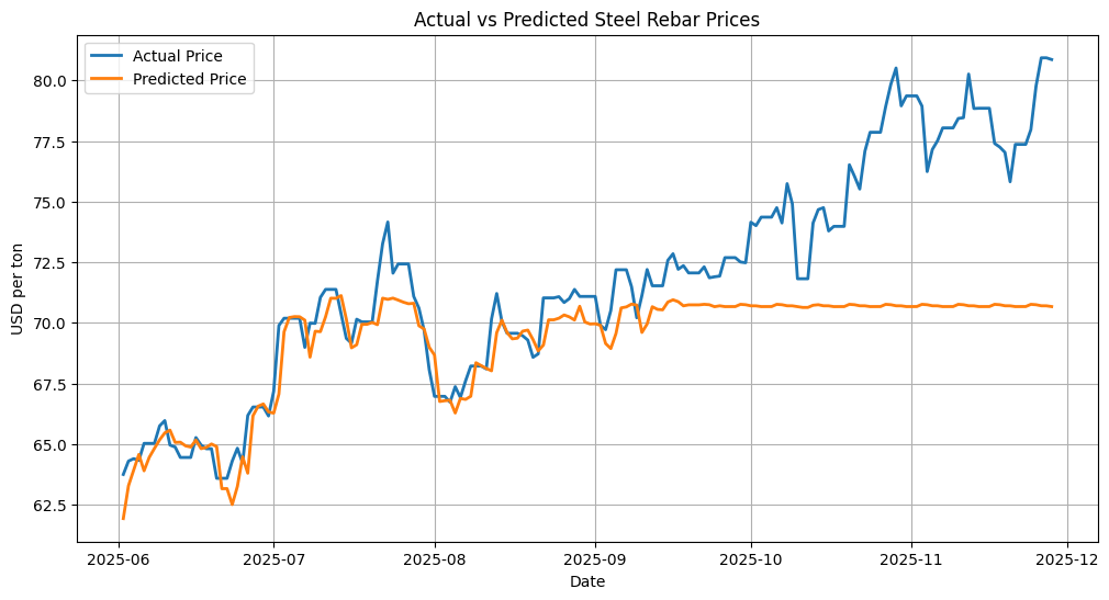 For the baseline model, I use a Random Forest Regressor, a tree-based ensemble method that performs well even with modest feature engineering and does not require the strict statistical assumptions of classical forecasting models. After fitting the model on the training set, I generate predictions for the test period and evaluate performance using MAE and MAPE. The resulting error metrics are strong, showing that the model captures the general level and short-term fluctuations of steel prices. However, when visualizing the predictions against the actual prices, an important limitation becomes clear: Random Forest models cannot extrapolate beyond the price range seen during training. When the steel market enters a new price regime, such as the surge observed after September 2025, the model flattens and remains constrained near the highest values observed historically.