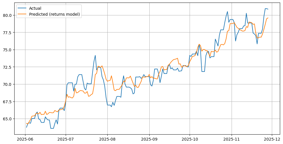 The turning point came when I reframed the problem in terms of log-returns and trained an XGBoost Regressor on these transformed targets. Modeling relative day-to-day changes rather than absolute price levels allows the model to learn momentum, acceleration, and mean-reversion patterns that are invisible when working directly with raw prices. More importantly, log-returns remove the structural ceiling that tree-based models face when the market breaks into new price territory. By compounding the predicted returns back into price space, the model can follow upward or downward shifts that extend beyond the training range. The error metrics reflected this improvement immediately; the return-based XGBoost achieved the lowest MAE and MAPE in the entire experiment and visually produced the most credible trajectory across the test window.