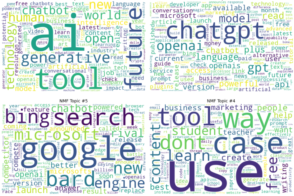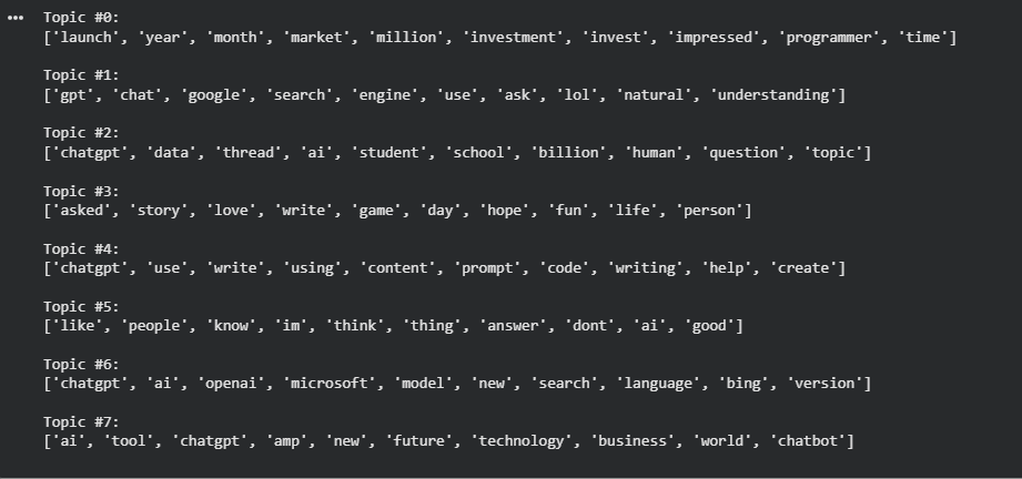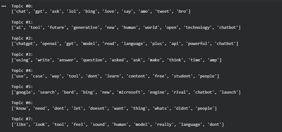In this output, several themes appear more clearly defined, such as direct comparisons with Google and Bing, discussions around specific products and APIs, practical usage scenarios, and everyday reactions expressed in informal language. Because TF-IDF reduces the influence of very common terms, NMF is better at separating concrete use cases, platform rivalries, and hands-on interactions with ChatGPT. This makes the model particularly useful for understanding detailed sub-conversations within a large and noisy dataset.