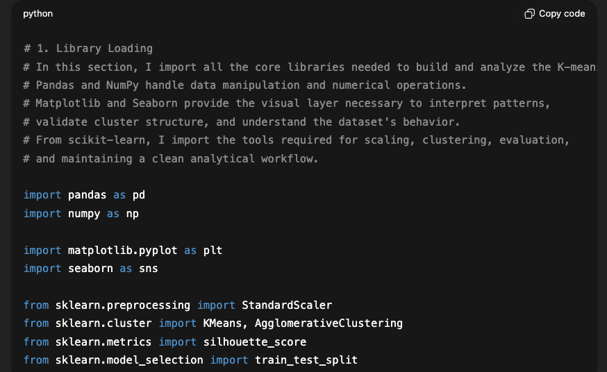 In this first section of the notebook, I import the essential libraries required for the analysis and for building the segmentation model. I use pandas and numpy as the foundation for manipulating and transforming the data; pandas allows me to work with tabular information in a way that feels like an advanced version of Excel, while numpy handles the numerical operations that support the machine learning algorithms.