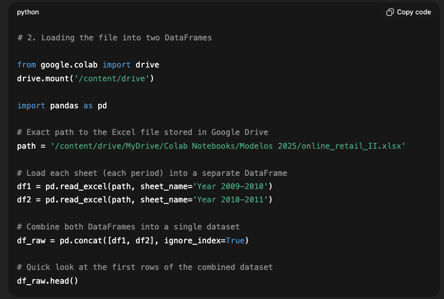 In this section of the project, I load the source file that contains the Online Retail II dataset. Since I am working in Google Colab, the first step is to mount Google Drive, which gives me access to the file stored in my personal repository. Once the environment is set up, I use pandas to read the Excel file, which includes two different sheets corresponding to two transactional periods (2009–2010 and 2010–2011).