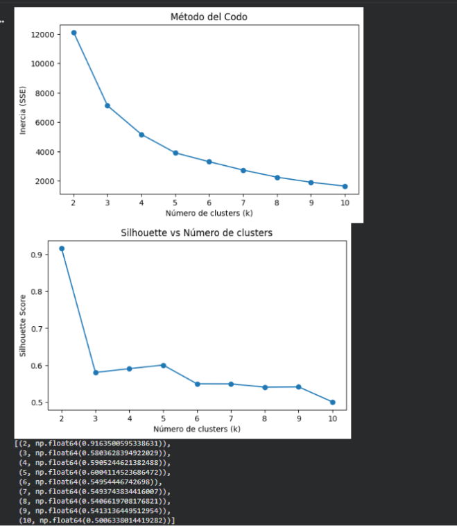Both metrics are stored in lists so they can be plotted afterward. I then generate two visualizations: the elbow method based on inertia, and the silhouette curve for each value of k. Finally, I print a list with all the computed values to compare them explicitly.