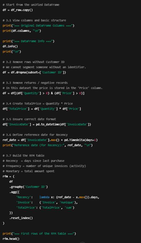 Finally, I built the RFM table, grouping transactions by customer and calculating three key behavioral indicators: