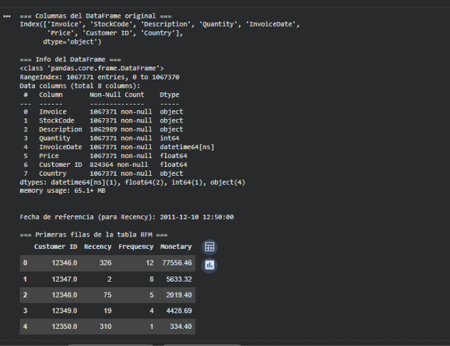 The results observed after the preprocessing stage confirm that the dataset was cleaned, filtered, and transformed correctly in order to build the RFM table. First, the original columns from the file are displayed, which allows me to verify that the variable names and types match the expected structure. Then, the df.info() report shows that the dataset contains more than one million valid transactions after removing entries without a Customer ID and those with inconsistent values. The columns have appropriate types: quantities and prices are numerical values, and the dates were successfully converted into the datetime64 format, which is essential for calculating the Recency variable. The reference date displayed, 2011-12-10, corresponds to one day after the last recorded transaction in the dataset and serves as the comparison point to determine how recent each customer’s last purchase was.