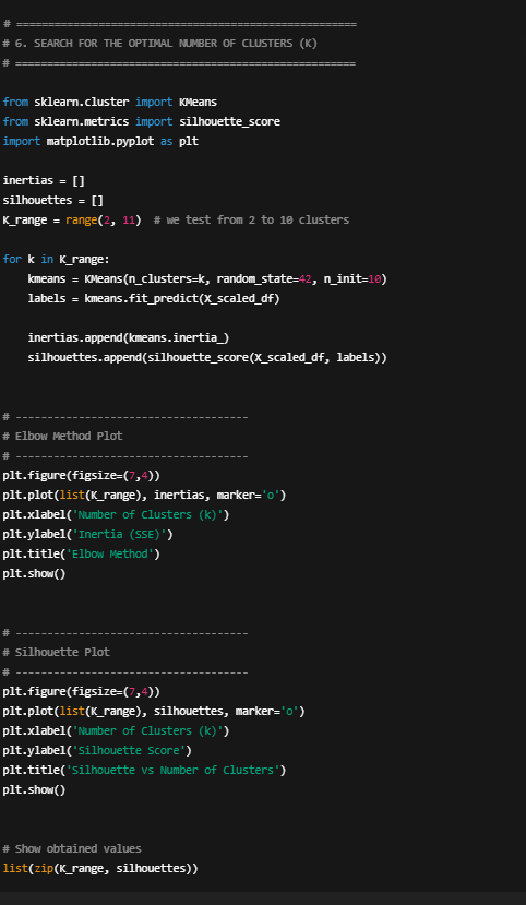 In this block of code, I perform a systematic search for the appropriate number of clusters for the K-means model. I begin by defining a range of possible values for k, from 2 to 10, since fewer than two clusters makes no sense and more than ten tends to produce overly fragmented groups. For each value of k, I train a K-means model using the scaled RFM data and compute two key metrics: