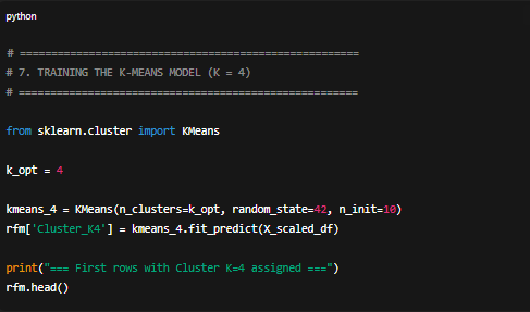 I then fit the model using the scaled RFM data and assign each customer to a cluster, storing the result in the new Cluster_K4 column. This step establishes the foundation for the next phase, where I will interpret the profile of each group and analyze their relevance in terms of customer behavior.