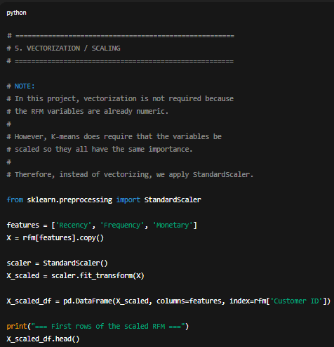 In the vectorization phase, I clarified that this step is not required for this project because the RFM data is already in numeric format and does not need any transformation to convert text or categorical values into vectors. However, since the K-means algorithm is highly sensitive to the scale of the variables, I performed a normalization process using StandardScaler. This ensures that Recency, Frequency, and Monetary all contribute proportionally to the distance calculations. In this way, I adapt the traditional “vectorization” step to what a numerical clustering model actually needs.